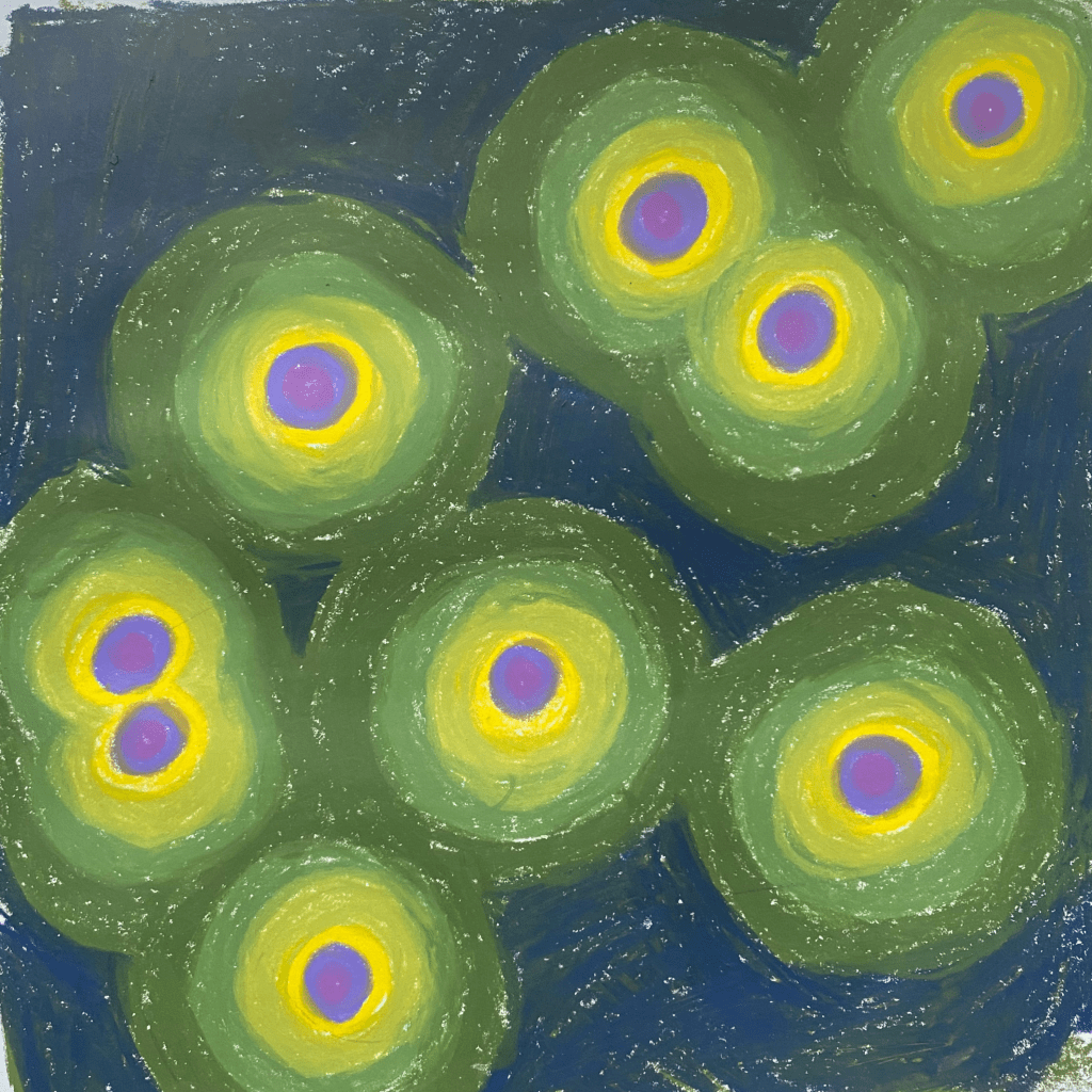 Comments: I just felt like another relaxing day, so I used some nice soft wax pastels and did some calming repetitive motions to create an abstract. I was on a trip, so I only had a few colors with me. I think this is less successful; it reminds me of pond water.
